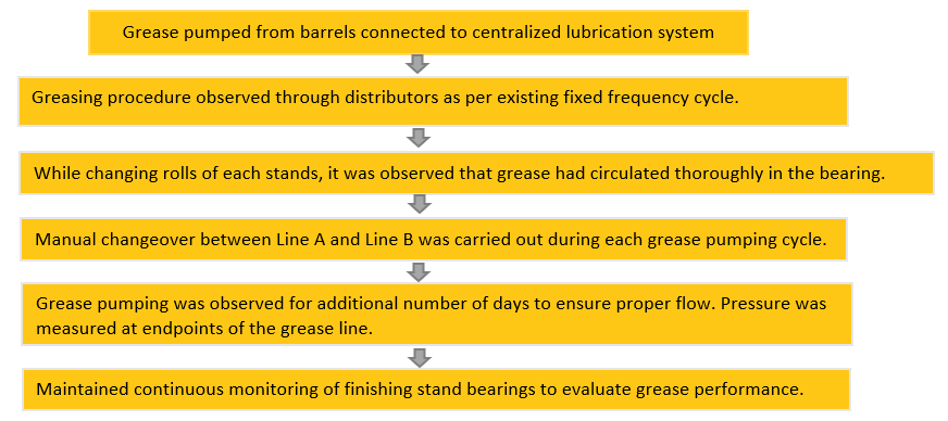 Having previously encountered tube choking issues with NLGI 2 greases, the maintenance team was initially reluctant to approve a trial in the centralized lubrication system. However, the BECHEM team, addressed these concerns by presenting proven performance data and success stories from similar applications in other steel plants. This evidence convinced the customer to proceed with a controlled trial.