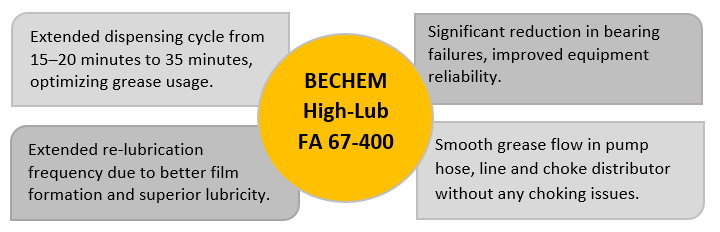 As the trial progressed, the customer observed a steady improvement in grease flow and distribution, with no issues of distributors choking. Satisfied with the consistent performance and a drastic reduction in bearing-failures, the customer, switched over to BECHEM High-Lub FA 67-400.